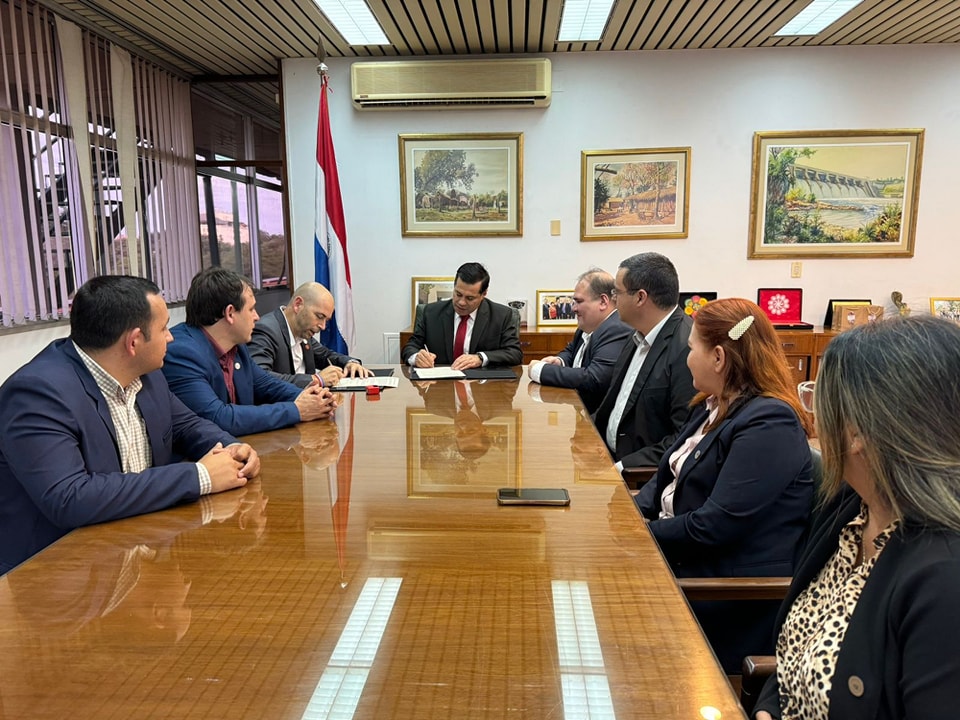 El Intendente Municipal, Lic. Jaime Hinterleitner, acompañado por el Presidente de la Junta Municipal, Diego Sanguina, y los Concejales Municipales Néstor Valenzuela, Mirian González, Diego Colman, Gladys González y Ever Bareiro, realizaron una visita al presidente de la ANDE, Ing. Félix Sosa. El propósito de esta reunión fue alcanzar los objetivos del Convenio Marco que busca mejorar el servicio eléctrico en la localidad.