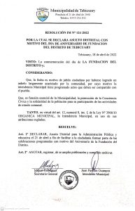 Por la cual se declara asueto distrital con motivo del día del aniversario de Fundación del Distrito de Tebicuary