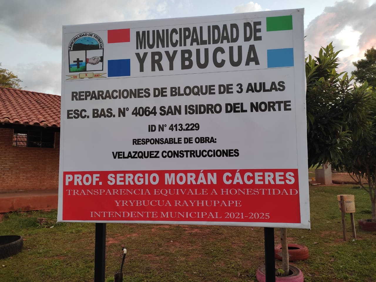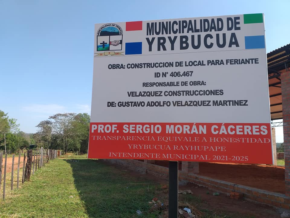 Estamos llevando adelante la obra de construcción de un tinglado con baños sexados, agua corriente y otras comodidades, en donde los pequeños productores AGRO-GANADERA podrán exhibir y vender su producción. Cumpliendo partes con unas de las prioridades de esta administración. Adm. Prof. Sergio Morán Cáceres. -Transparencia Equivale a Honestidad. -Yrybucua Rayhupape